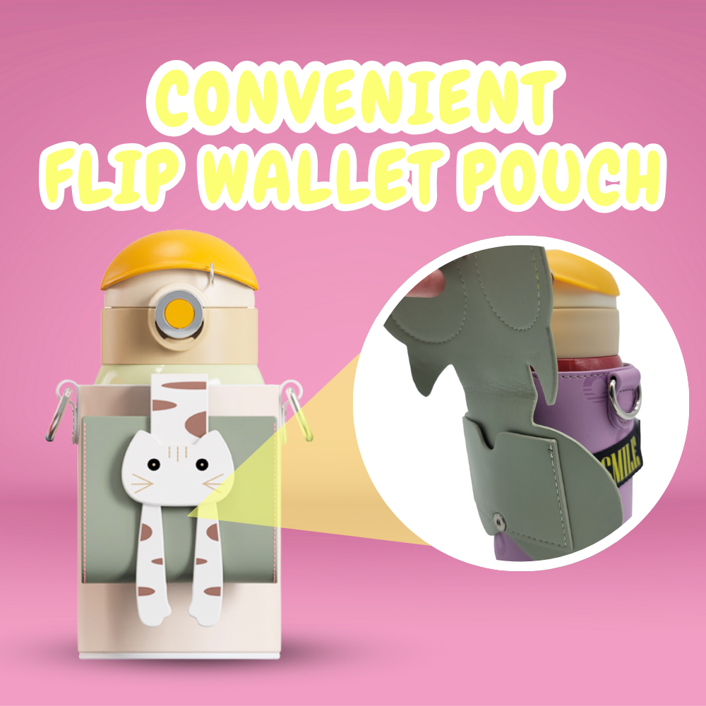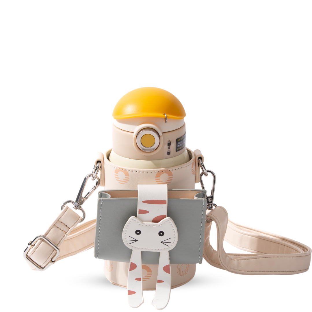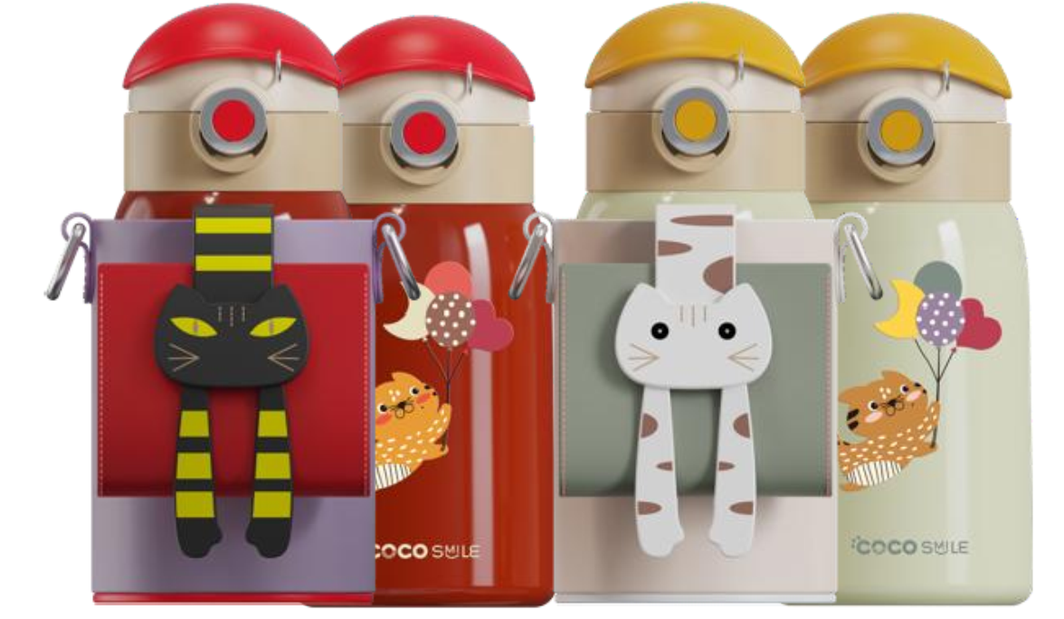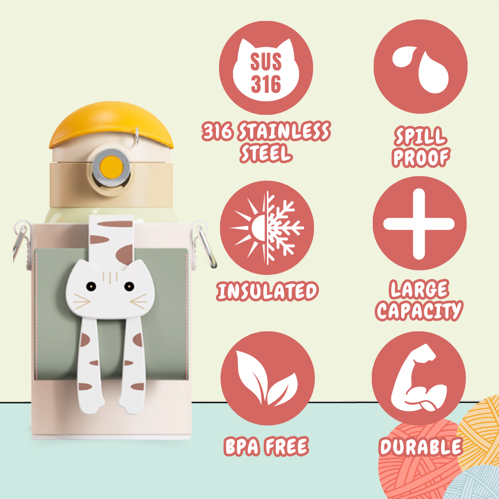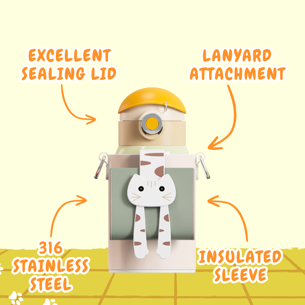 Features: Lying cat design, double-wall insulation, leak-proof lid, easy-open button, carrying handle