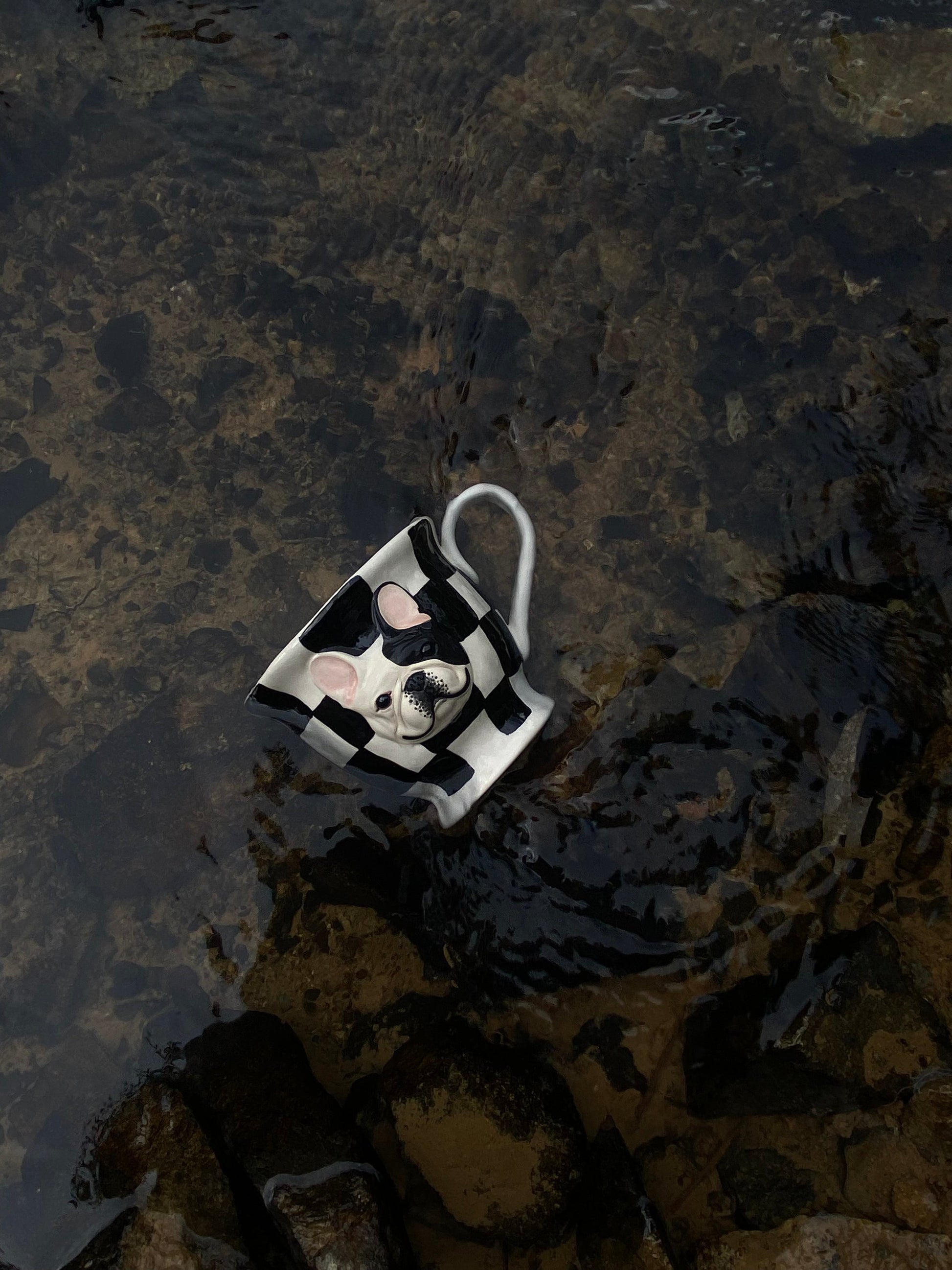 This handcrafted ceramic coffee mug features an irresistibly cute 3D French Bulldog peeking out from a playful checkered design. Each cup is carefully hand-painted, making every piece a unique expression of artisan charm.